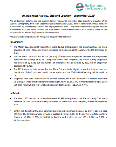 An intelligence briefing covering the characteristics of enterprises by employment size band, turnover and sectors